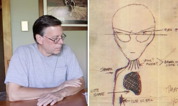 “One day, as I was walking down a hallway, I noticed the doors leading to the hangars were smaller than the ones in the corridors. Each had a 9-inch square window with thin wires running through it, positioned just above head level. As I was walking by, I just glanced in and I noticed – at a quick glance – there were two guys in white lab coats, facing me towards the door. They were looking down and talking to something small with long arms. I was just surprised as I walked by, and I only caught a glimpse. I don’t know what on earth that was.”